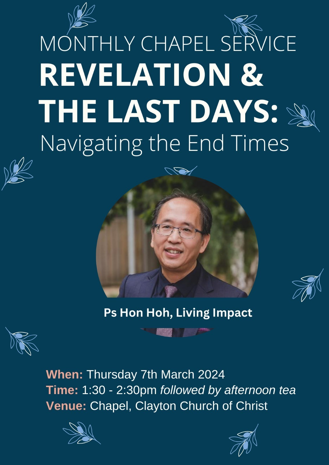 You can watch a forty-minute message on the End Times delivered by the author of Revelation and the Last Days, recorded live from a chapel service held at Clayton Church of Christ, Victoria, Australia.